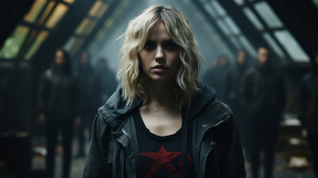 Woman sinister look with red eye in dark cinematic setting. Generative AI