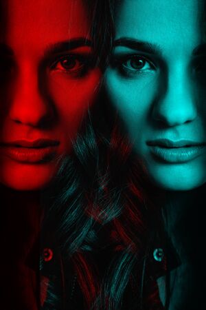 photo of beautiful woman with mixed red and blue lighting , generative AI
