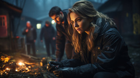 A forensic team investigates a crime scene at night, with a focused female detective examining evidence amidst a group of police officers under ambient lighting.