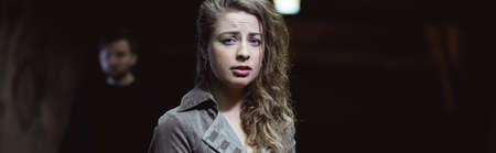 Panorama of suspicious man spying on afraid female