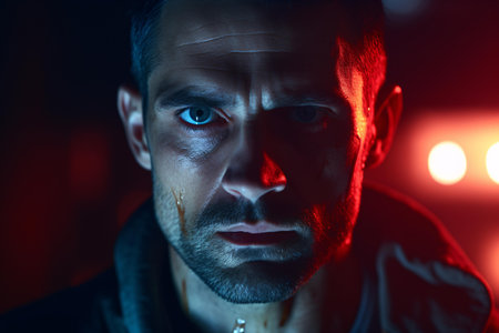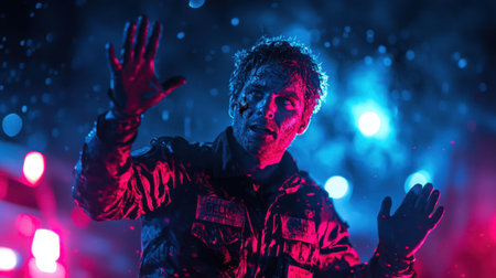 A gripping portrayal of a man in distress during a night emergency, showcasing vivid blue and red lighting with rain, capturing raw emotions and an intense atmosphere.