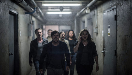 Medium shot of performers weaving through a warehouse hallway the gritty industrial backdrop out of focus to emphasize emotional storytelling in a confined space.