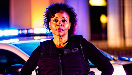 photo of middle aged police officer law enforcement standing in front of police car at night with back light, generative AI