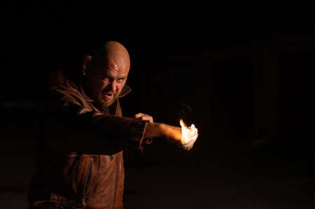 Bald Caucasian man beats with a burning fist.