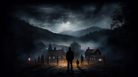 Groups of individuals walk through dense fog illuminated by an orange glow. The night setting near a house creates a mysterious and haunting atmosphere, enhancing the sense of intrigue.