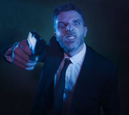 scary dark portrait of young crazy psycho and furious man in businessman suit holding handgun in sick upset and threatening face expression isolated on grunge background in crime concept