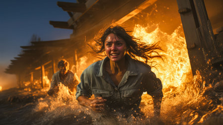 An AI generated illustration of a woman running out of a burning, flooded house