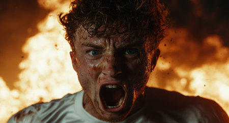 Intense expression of a man in a fiery, dramatic scene