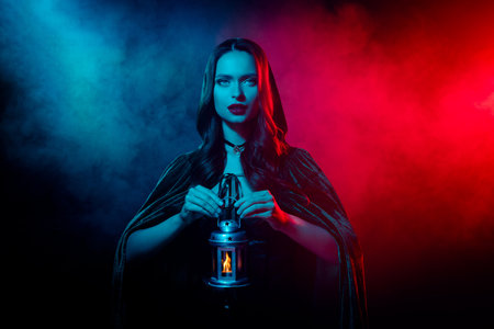 Photo of lady look evil devil hold show antique candle wear hood cape isolated mist neon color background