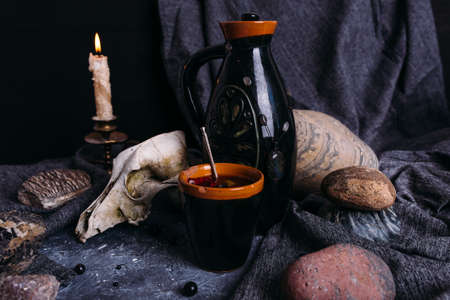 Old dog skull, jug and stones on witch table. Enchanted drink with flower petals