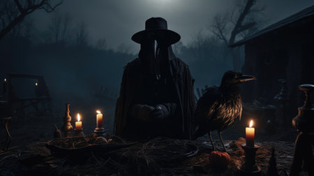 Plague doctor, pestilence contagion epidemic, middle age, bubonic fever, black death, protective suit, dangerous disease.