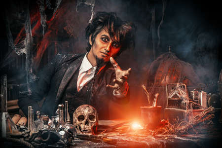 Evil old wizard or alchemist making the witchcraft in a dark and scary dungeon. Halloween image.