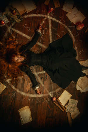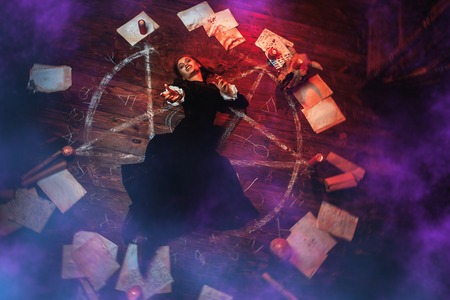Young demonic woman sitting near magic circle
