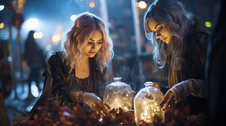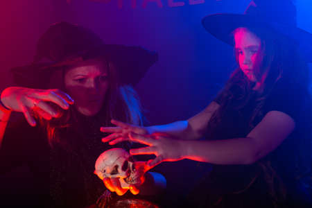 Two halloween witches making a potion and conjure in halloween night. Magic, holidays and mystic concept.