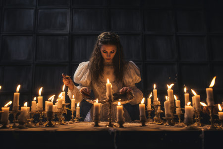 Woman fortune-teller guesses fate of night at table with candles