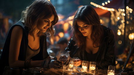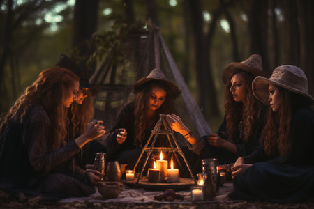 The enchanted forest gathering: a mystical Halloween celebration of friendship and tradition with candles, magic, and witchcraft-themed costumes