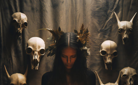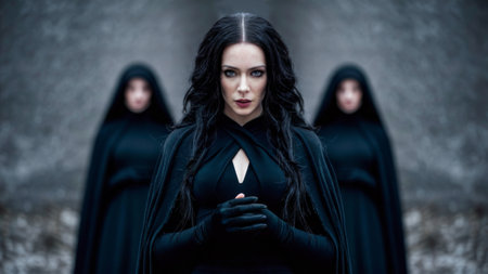 Mysterious woman with intense gaze in a mystical setting