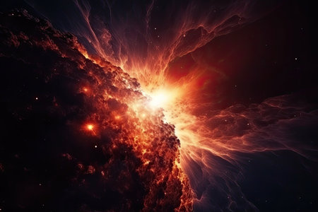 Birth of supernova star. Big bang explosion in outer space. The genesis of a new planet in the galaxy. Expansion of universe. Gas dust clouds nebula background.