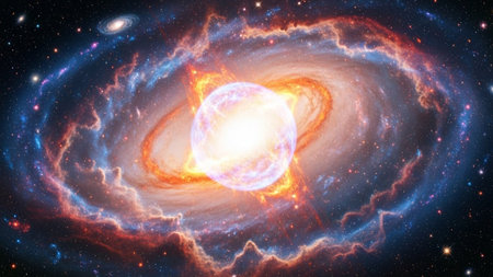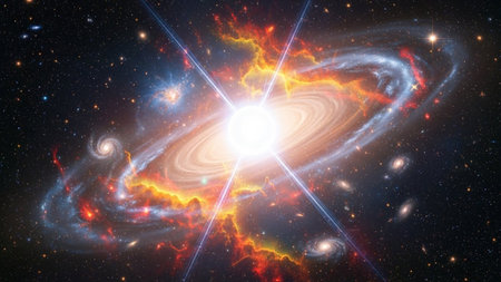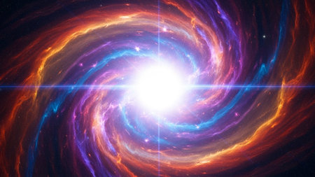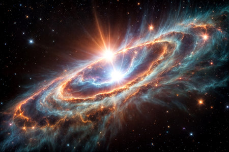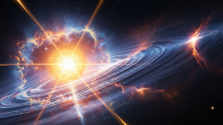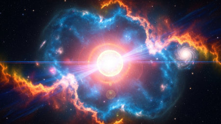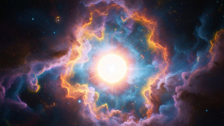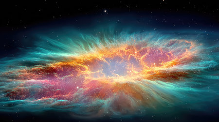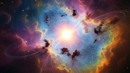 Bright showing vibrant cosmic nebula explosion with bright yellow center, orange and blue gas clouds, and streaks of...