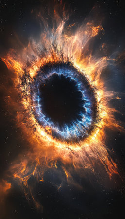 The eyes of the black hole in space, with blue and orange flames surrounding them, form an iris-shaped structure. The center is surrounded by a ring-shaped nebula. High-definition photography style, against a black background. --ar 73:128 --v 6.1 Job ID: be4ddc33-cc14-4766-a5fd-4af2c9bbf71e
