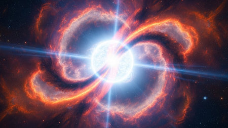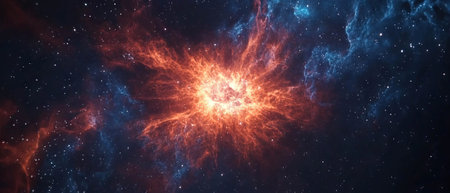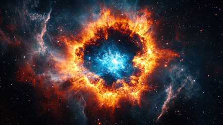 A cosmic explosion with a blue and white center surrounded by fiery orange gas and a star field.