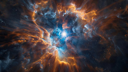 Vibrant cosmic nebula with orange and blue hues surrounding a bright star in deep space, illuminating the universe. Mystical outer space exploration concept