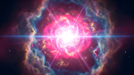 A stunning depiction of a nebula in deep space, characterized by a bright central explosion surrounded by vibrant pink, blue, and orange hues. The image captures the dynamic and colorful nature of the cosmos, with radiant light beams emanating from the center, set against a dark, star-studded background.