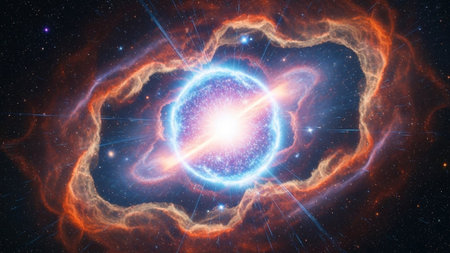 A cosmic explosion with a blue and white center surrounded by fiery orange gas and a star field.