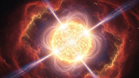 A vibrant star releases intense solar flares, illuminating the surrounding cosmic expande with bright energy.