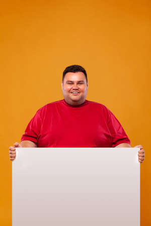 Fat man in red t-shirt displaying a white banner ad isolated over a yellow background.