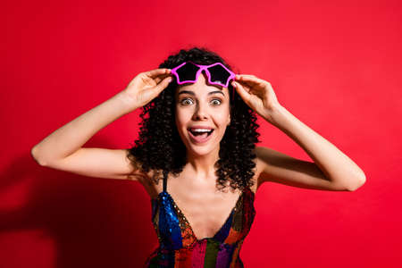 Photo of pretty young girl hold specs excited face wear star-shaped sunglass glossy dress isolated bright red color background