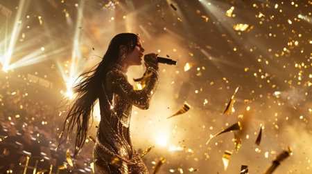 showing concert crowd cheering under a shower of gold confetti and dramatic stage lighting creating an energetic and celebratory atmosphere. resolution...