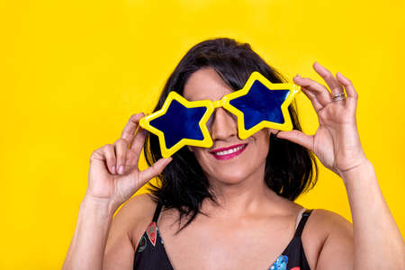 125 / 5.000 Translation Results Beautiful woman is wearing yellow star-shaped glasses. Young brunette woman is happy and having fun at the party.
