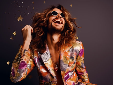 Man in colorful suit and sunglasses surrounded by confetti and streamers. Generative AI.