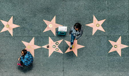 Los Angeles, USA - March 5, 2019: aerial of with tourists looking for stars and actors earning money by posing for movie figures.