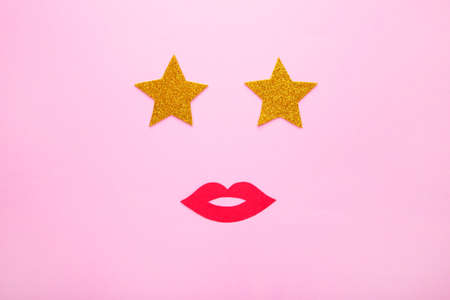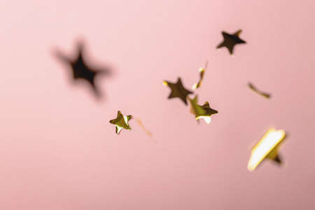Background with flying gold confetti stars. Pink background. Wallpaper.