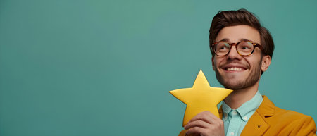 A businessman proudly displaying a golden fivestar quality assurance guarantee for his IS. Concept Business, Quality Assurance, Guarantee, Certification, Professionalism