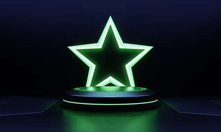 Modern products showcase sci-fi podium with green glowing light neon star shape background. Technology and object concept. 3D illustration rendering
