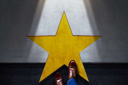 Success in Business or Personal Talent Concept. Top View of Business Person Start and Steps into a Golden Star. Light Shining on the Dark Cement Floor