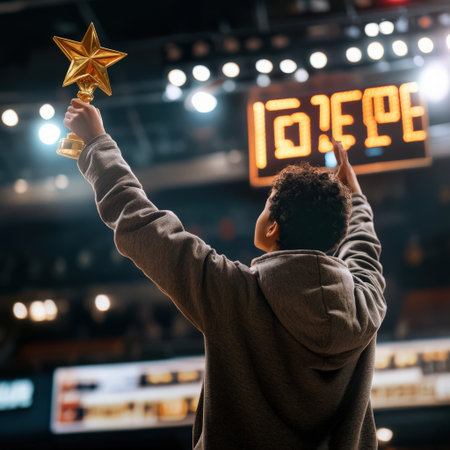 A person holding a golden star trophy, standing proudly in front of a scoreboard displaying top