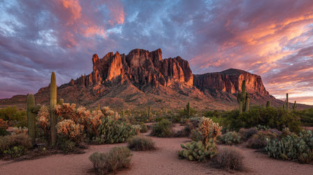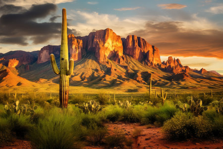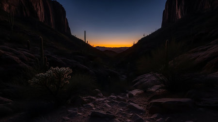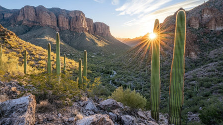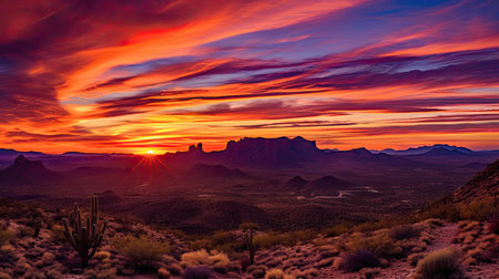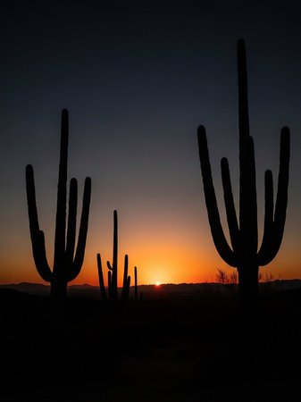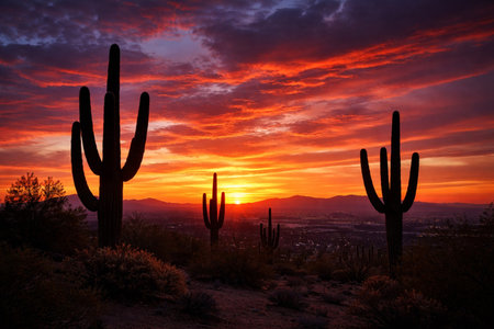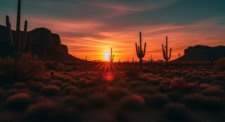 Sunset showing vibrant desert sunset with saguaro cacti silhouetted against a fiery orange and pink sky casting long shadows across the arid...