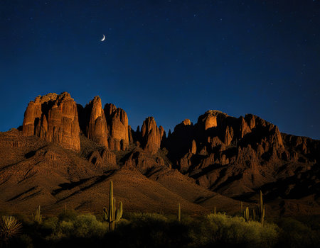 A dark desert landscape at night silhouetted saguaro cacti and mountains under a deep blue sky with a visible crescent moon and scattered stars.