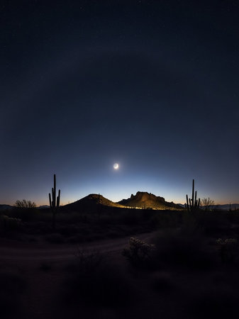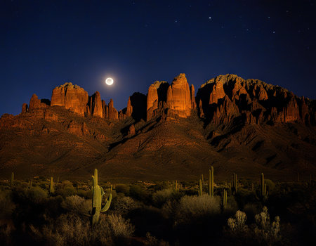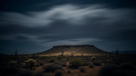 A desert landscape at night with various cacti and shrubs, illuminated by a strong light source on a flat-topped mesa under a cloudy sky.
