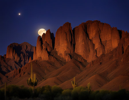 A large red moon hangs in the twilight sky over a serene Sonoran desert landscape. The iconic silhouettes of saguaro cacti and rocky formations are set against a beautiful orange and dark blue gradient sky, creating a peaceful and mystical desert night scene.