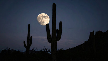 Full moon rising behind saguaro cactus silhouette, purple twilight sky, Sonoran Desert landscape