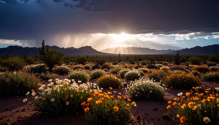 Rare desert wildflowers blooming across arid landscape after rainstorm, vibrant colors, no humans.