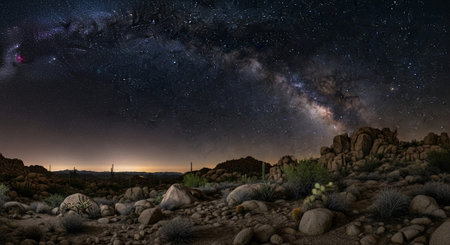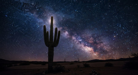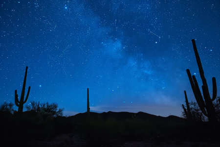 Captivating nocturnal landscape with the milky way galaxy and cactus silhouettes under a meteor shower