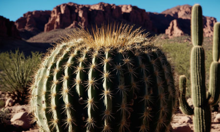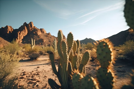 An AI generated illustration of various species of cacti and succulents in a natural desert setting, with a clear blue sky in the background