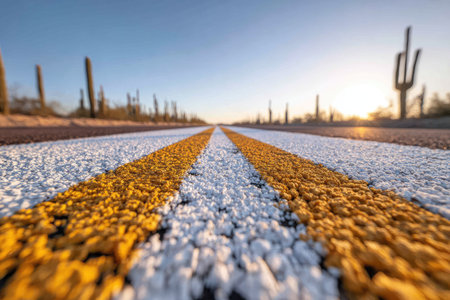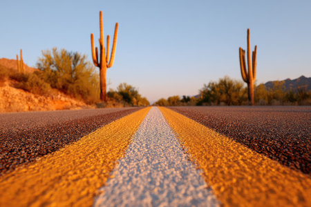 Close-up view of a roadway with yellow and white lines, leading through a desert landscape with cacti and sparse vegetation. The asphalt texture is in focus, with the lines of demarcation.