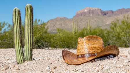 A striking cowboy hat rests on sandy ground next to a tall cactus, capturing the essence of desert life in a beautiful and vibrant landscape.